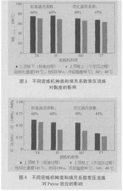 (1)常壓混煉——硅烷化這一步在常壓即密煉機(jī)上頂栓抬起不加壓的情況下進(jìn)行。為了改善進(jìn)料性能、硅烷化效率和密煉機(jī)能力,對(duì)填充系數(shù)進(jìn)行了優(yōu)化;