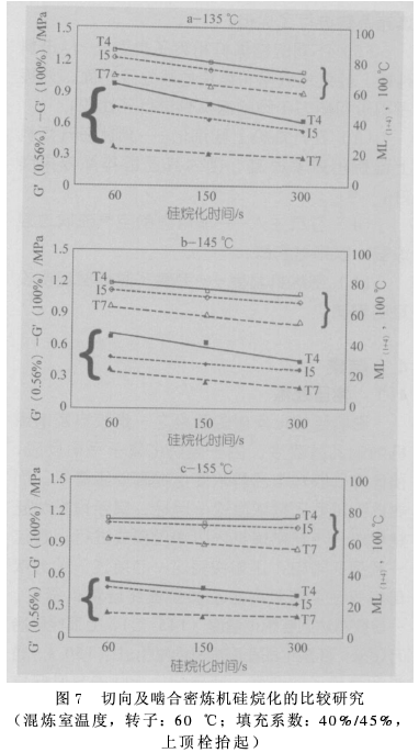 對(duì)3種不同的密煉機(jī)型號(hào)(T7、T4、I5)進(jìn)行了比較研究。圖7a~c所示的是在完全硅烷化過(guò)程中,切向F4W-密煉機(jī)(T7)在研究的所有溫度水平(135~155℃)下給出了最佳結(jié)果;在類似的操作條件下,該類轉(zhuǎn)子的黏度及P a y n e效應(yīng)最低。尤其是在硅烷化的初期(溫度水平低,硅烷化時(shí)期短),這種密煉機(jī)的運(yùn)行效果要好得多。嚙合型密煉機(jī)在2種切向型密煉機(jī)之間處于居中位置。當(dāng)硅烷化反應(yīng)繼續(xù)進(jìn)行時(shí)(硅烷化時(shí)間更長(zhǎng),硅烷化溫度更高),3種密煉機(jī)之間Pa y n e效應(yīng)的差異逐漸縮小。與此類似,黏度減小了,但不同密煉機(jī)的值并未會(huì)聚于一點(diǎn)。
