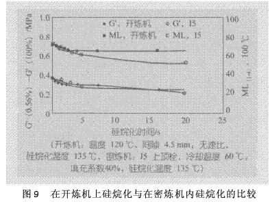 預(yù)計(jì)開(kāi)煉機(jī)的硅烷化效率會(huì)非常高,然而實(shí)驗(yàn)表明實(shí)際并非一定如此(圖9)。在此實(shí)驗(yàn)中,硅烷化是在輥隙4.5 mm的開(kāi)煉機(jī)上進(jìn)行的。在密煉機(jī)中,轉(zhuǎn)子與混煉室室壁之間的間隙是3.3 mm。結(jié)果,開(kāi)煉機(jī)上車(chē)料薄通出片較厚,因而限制乙醇從膠料中蒸發(fā)出來(lái)。硅烷化效率降低的另一因素是開(kāi)煉機(jī)上的材料積存。開(kāi)煉機(jī)上某些部分材料通過(guò)縫隙,不如密煉機(jī)內(nèi)膠料那么頻繁。這2個(gè)因素均會(huì)限制開(kāi)煉機(jī)上硅烷化的效率。在優(yōu)化的條件下,開(kāi)煉機(jī)上膠料少些而出片薄些,可進(jìn)一步提高開(kāi)煉機(jī)上硅烷化的效率。