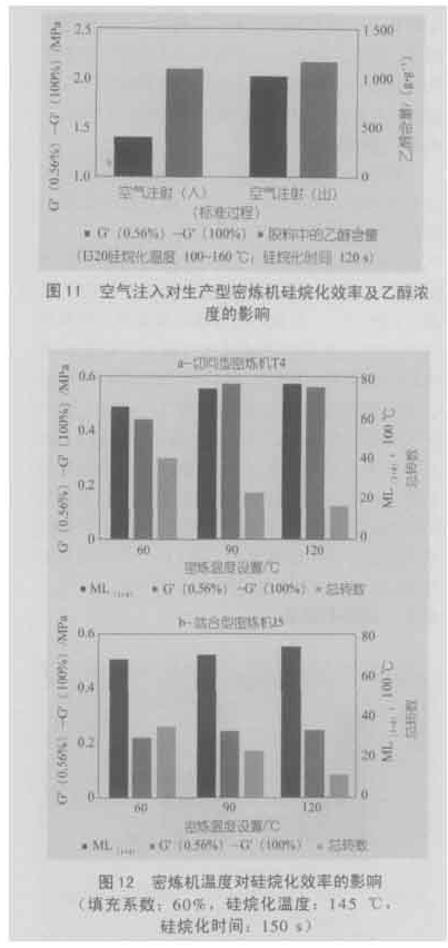 提高乙醇排除率的另一項(xiàng)措施是在硅烷化這一步時(shí)向密煉機(jī)注入空氣。首先在實(shí)驗(yàn)室內(nèi)以較大規(guī)格設(shè)備(I45)進(jìn)行了一系列試驗(yàn)。空氣從密煉機(jī)底部注入,沒(méi)有考慮專門(mén)注入空氣的出口。在標(biāo)準(zhǔn)條件下將膠料加熱至硅烷化溫度(145℃)。當(dāng)膠料達(dá)到這一溫度后,即開(kāi)始注入空氣,并對(duì)轉(zhuǎn)子速度進(jìn)行調(diào)節(jié),以便保持硅烷化所需要的溫度。圖10示出該膠料的性能以及與相同條件下(除切斷空氣注入外)硅烷化膠料性能的比較??諝庾⑷虢档土薖a y n e效應(yīng)、黏度及膠料內(nèi)的水分含量,乙醇排除更為有效。這些結(jié)果得到了生產(chǎn)型設(shè)備中320 L密煉機(jī)內(nèi)混煉的一系列膠料的驗(yàn)證。注入空氣時(shí)硅烷化的效率也明顯高得多(圖11)。所有的其他性能與標(biāo)準(zhǔn)白炭黑膠料的性能差不多。