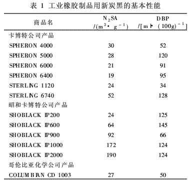 目前,已投放市場的工業(yè)橡膠制品用新炭黑,卡博特公司的產(chǎn)品有SPHERON 4000、SPHERON5000、SPHERON 6000、SPHERON 6400、STER-LING 1120和STERLING 6740等;昭和卡博特公司的產(chǎn)品有SHOBLACK IP200、SHOBLACKIP600、SHOBLACK IP900、SHOBLACK IP1000和SHOBLACK IP2000等;哥倫比亞化學(xué)公司的產(chǎn)品有COLUMBIAN CD 1001、COLUMBIAN CD 1003和COLUMBIAN CD 1004等。這些新炭黑的比表面積(N2SA)和吸油值(DBP)的典型值見表1。