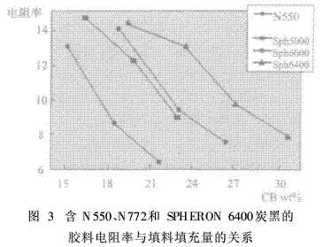含N550、N772和SPHERON 6400炭黑的膠料,其電阻率與炭黑填充量的關(guān)系見圖3。這些結(jié)果是由于這種新炭黑的表面積超出了傳統(tǒng)爐法炭黑的限度,達(dá)到較好的分散速率,減少了電流通道的形成。另外,由于SPHERON 6400膠料中取代一部分非炭黑填料,白色填料的比例減少了,也使膠料的壓縮變形特別低。