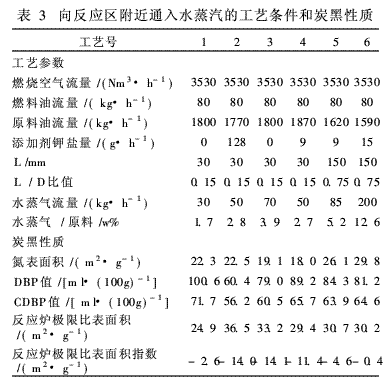向反應(yīng)區(qū)附近通入水蒸汽的試驗(yàn),其中6個(gè)工藝號(hào)的工藝參數(shù)和炭黑性質(zhì)示于表3。