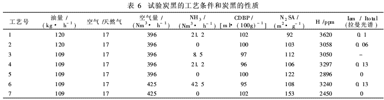 試驗(yàn)炭黑的工藝條件和炭黑的性質(zhì)參見表6。為了向反應(yīng)區(qū)內(nèi)提供富氫氣氛,工藝號(hào)1、3、4和6是以氨氣作為氫源,添加到反應(yīng)爐的高溫反應(yīng)區(qū)中。為了說明這種加氫的效果,表中也列出未添加氨的工藝號(hào)2、5和7的試驗(yàn)結(jié)果作為對照。
