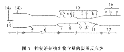 新日鐵化學(xué)采用控制溶劑抽出物含量的方式,改善炭黑在膠料中的分散性??煽刂迫軇┏槌鑫锖康奶亢诜磻?yīng)爐結(jié)構(gòu)如圖7所示。1是前燃燒段, 2是后燃燒段, 3是反應(yīng)段, 4是急冷段。反應(yīng)段3的縮口部位10的直徑為70mm,縮口后面的錐形部位11的發(fā)散角度為6°。反應(yīng)段3的爐壁上設(shè)有多處原料油注入點(diǎn)15(如圖所示,由15a至15,i共9處),急冷段設(shè)有3處急冷水入口16。甲苯抽出物(Ts)的含量可選擇合適的原料油入口到急冷點(diǎn)的停留時(shí)間來調(diào)節(jié)。縮短停留時(shí)間,炭黑的Ts值則增加。至于甲苯抽出物(Ts)與吡啶抽出物(Ps)之比(Ts/Ps)是影響炭黑性能的一個(gè)參數(shù),它可用原料油入口之前的高溫燃燒氣中的殘余氧含量和原料油量之比來調(diào)節(jié)。