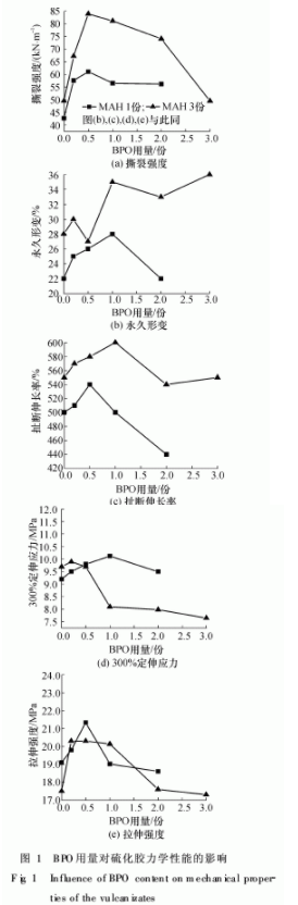 MAH單體改性NR后的NR/HAF復合材料硫化膠的力學性能測試結(jié)果見圖1.從圖1可以看出,在MAH單體用量相同時,隨引發(fā)劑BPO用量的增加,NR/HAF復合材料硫化膠的拉伸強度、300%定伸應力、撕裂強度和扯斷伸長率基本上都呈現(xiàn)先增后降的趨勢