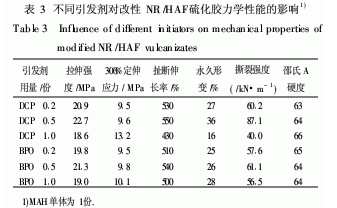 兩種引發(fā)劑BPO和DCP對于MAH改性NR/HAF復合材料硫化膠力學性能的影響的比較見表3.