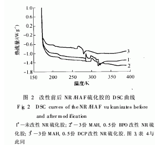 熱穩(wěn)定性分析參照文獻[9]的方法進行.NR/HAF和MAH改性NR/HAF硫化膠的差示掃描量熱(DSC)測試分析結(jié)果見圖2.從圖中可以看出,未改性的NR與HAF復合材料硫化膠的Tg為214·96K,而3份MAH和0·5份BPO改性的NR與HAF復合材料硫化膠的Tg為214·93K;用3份