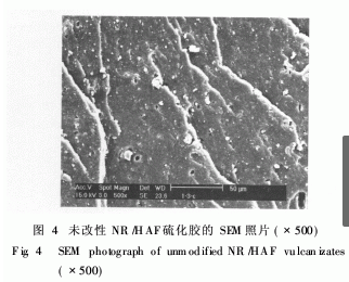 圖4是未改性的NR與HAF混煉膠硫化膠斷面放大500倍的掃描電鏡照片,可以看出,硫化膠中炭黑粒子分布不均勻,有較大團塊出現(xiàn),斷面有較多因炭黑脫除留下的光滑孔洞.