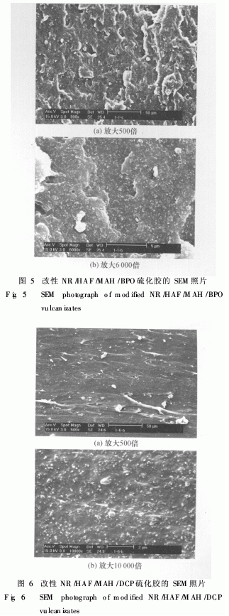 從圖5和圖6中可清晰看到經(jīng)MAH接枝改性的NR與HAF的混煉膠,炭黑的分散得到明顯改善,炭黑粒子分布均勻且相界面模糊,撕裂斷面有撥絲現(xiàn)象,斷面上因炭黑脫除留下的孔洞極少.這可能是由于MAH單體在混煉過程中的機械力和硫化過程中的熱作用下,與NR大分子上產(chǎn)生接枝共聚反應的同時,也與HAF表面的活性基團產(chǎn)生了化學反應,從而在硫化膠中形成“整體網(wǎng)絡效應”,加強了橡膠與炭黑之間的結(jié)合效果.圖5與圖6比較可見,以DCP為引發(fā)劑時得到的混煉膠中的炭黑分布比以BPO為引發(fā)劑時更為均勻,結(jié)合更緊密,因此力學性能更好.