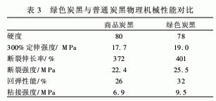表3所列數(shù)據(jù)是分別采用普通炭黑、綠色炭黑的天然橡膠膠料的物理機(jī)械性能對比。可以看出,對于同樣的配方,用綠色炭黑代替普通商業(yè)炭黑后,硫化膠的斷裂強(qiáng)度、斷裂伸長率、300%定伸應(yīng)力、回彈性、與金屬粘合強(qiáng)度均有明顯提高,硬度略有降低。