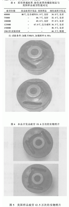 圖4、5是采用綠色炭黑開發(fā)的某橡膠制品與美國樣品疲勞實(shí)驗(yàn)后的實(shí)物照片??梢?采用綠色炭黑的橡膠制品,最大生熱比采用普通炭黑降低約44%以上,疲勞壽命提高約5倍;與美國樣品相比,最大生熱降低33%以上,疲勞壽命提高50%以上。