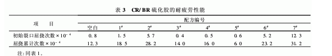 偶聯(lián)劑品種對膠料出現(xiàn)初始裂口的時間和疲勞壽命有一定影響。不同偶聯(lián)劑改性納米白炭黑填充CR/BR硫化膠的耐疲勞性能如表3所示。