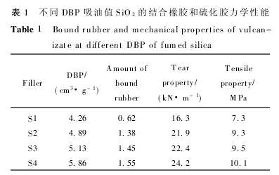 粉體的結(jié)構(gòu)性反映了SiO2網(wǎng)絡(luò)的疏密程度,通常由DBP吸油值(每100g納米SiO2吸收的鄰苯二甲酸二丁酯的體積)表示。由于結(jié)合橡膠吸附在SiO2粉體表面,故粉體的結(jié)構(gòu)化程度對結(jié)合橡膠含量及硫化膠性能影響顯著。由表1可見,由S1到S4粉體的DBP值逐漸增加,粉體的結(jié)構(gòu)性增高,即S4粉體的結(jié)構(gòu)性最高。結(jié)構(gòu)性越高(SiO2球形粒子之間通過氫健等作用力順次排列成珍珠鏈狀結(jié)構(gòu)),每一聚集體所含粒子越多,表面活性點(diǎn)增加,單位體積內(nèi)所含固體物質(zhì)較少,空隙較多,在混煉的過程中,通過熱和機(jī)械力的作用,硅橡膠可以滲透到SiO2聚集體的細(xì)孔內(nèi),形成了納米二氧化硅和硅橡膠的結(jié)合。當(dāng)硅橡膠鏈段和SiO2聚集體孔隙在大小上一致時(shí),分散性好,形成的結(jié)合橡膠越多,補(bǔ)強(qiáng)性能越好。
