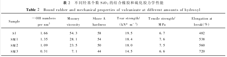 將100g生膠、適量羥基硅油和氣相法納米二氧化硅在16寸雙輥煉膠機(jī)上混煉均勻,薄通出片,部分硅橡膠混煉膠制成10mm×10mm×1mm薄片,用甲苯溶劑抽提,測定抽提后結(jié)合橡膠的量(用單位質(zhì)量SiO2表面結(jié)合硅橡膠的質(zhì)量表示)。一部分硅橡膠混煉膠加硫化劑,硫化條件175°C×t90。t90為用LH-90型硫化儀測定硫化膠的正硫化時(shí)間。