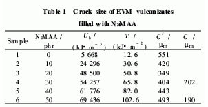 純EVM硫化膠的理論裂紋尺寸明顯大于NaMAA增強(qiáng)硫化膠,且隨著NaMAA用量的增加, EVM硫化膠的理論裂紋尺寸先降低,當(dāng)NaMAA用量超過(guò)20份時(shí),EVM硫化膠的理論裂紋尺寸又逐漸增大。EVM硫化膠的理論裂紋尺寸開(kāi)始降低是由于在EVM中加入少量NaMAA時(shí),NaMAA在EVM中分散得比較均勻,粒子較細(xì)。隨著NaMAA用量的增加,由于離子鍵的締合作用,NaMAA形成大的聚集體,在拉伸過(guò)程中這些大的聚集體作為斷裂源引發(fā)硫化膠的破壞,所以裂紋尺寸增大。因此,在純EVM硫化膠中,固體內(nèi)含物作為雜質(zhì)成為硫化膠的斷裂源;在NaMAA填充EVM硫化膠中,其拉伸斷裂是由于大的NaMAA聚集體引發(fā)裂紋導(dǎo)致硫化膠的破壞。NaMAA填充EVM硫化膠的裂紋尺寸約為200μm,該值低于其理論裂紋尺寸。