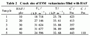 從表2可以看出,當(dāng)HAF用量小于40份時(shí),隨著HAF用量的增加, EVM硫化膠的拉伸斷裂能逐漸提高;當(dāng)HAF用量超過(guò)40份時(shí), EVM硫化膠的拉伸斷裂能逐漸下降。當(dāng)HAF用量為30份時(shí),EVM硫化膠的理論裂紋尺寸最小。