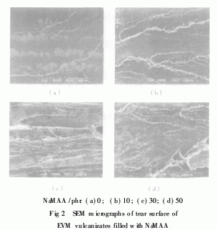 當(dāng)NaMAA用量為10份時(shí),EVM硫化膠的撕裂斷面上有很多寬的撕裂線,并以黏滑形式擴(kuò)展,同時(shí)較長(zhǎng)的撕裂線也發(fā)生支化,撕裂路徑偏移;當(dāng)NaMAA用量為30份時(shí),EVM硫化膠的撕裂斷面中存在著大量粗的撕裂線,而且在垂直于撕裂的方向上(即拉伸方向上)發(fā)生斷裂,這說(shuō)明在撕裂過(guò)程中,材料的破壞是拉伸和撕裂的綜合作用導(dǎo)致。這是由于不飽和羧酸鹽增強(qiáng)的橡膠應(yīng)力弛豫速度快,在形變過(guò)程中由于離子鍵的交換作用耗散大量能量,阻止了撕裂線的擴(kuò)展,從而使硫化膠具有較高的撕裂強(qiáng)度。