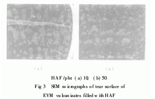 從圖3(a)中可以看出,HAF增強(qiáng)EVM硫化膠的撕裂斷面較平整,存在著長(zhǎng)而直的撕裂線。這說(shuō)明相應(yīng)的硫化膠撕裂能較低,這與表2中的數(shù)據(jù)一致。隨著HAF用量的增多, EVM硫化膠的斷裂面上撕裂線增多。