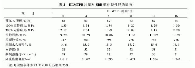 ELMTPB用量對(duì)SBR硫化膠性能的影響如表2所示。