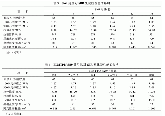 ELMTPB/Si69并用比對(duì)SBR硫化膠性能的影響如表4所示。