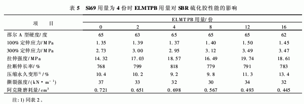于4/4時(shí),膠料拉伸強(qiáng)度和拉斷伸長率比用Si69改性白炭黑填充效果得到進(jìn)一步提高。基于這點(diǎn)出發(fā),固定Si69用量為4份,改變ELMTPB用量并測(cè)試SBR膠料性能,結(jié)果如表5所示。
