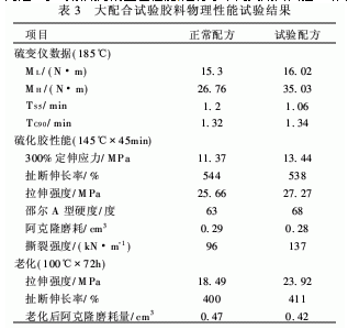 為進(jìn)一步考察配方的工藝性能,進(jìn)行了車間大配合試驗(yàn)。結(jié)果見表3,從物性結(jié)果可以看出,其結(jié)果與小配合試驗(yàn)結(jié)果基本吻合。