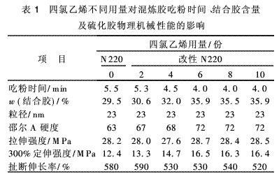 (1)用四氯乙烯處理后的炭黑,降低了粒子間的物理吸附性,混煉時炭黑能快速向橡膠相擴散,提高了炭黑在橡膠中的分散速度,縮短了混煉時間。
