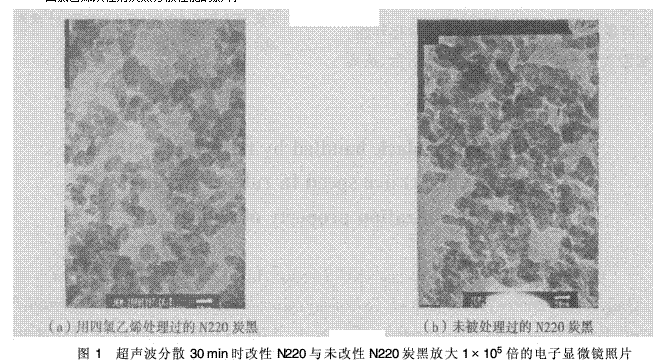 圖1是超聲波分散30 min時N220炭黑改性前后放大1×105倍的電子顯微鏡掃描照片。由圖1(a)可見,用四氯乙烯處理過的N220炭黑粒子被均勻地分散開來,而未被處理過的N220粒子則密密地堆積在一起,由此可以解釋混煉時吃粉時間縮短的原因: