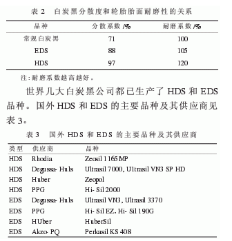 高分散性白炭黑(HDS)是一種具有高分散性且無(wú)粉塵的白炭黑產(chǎn)品,適用于“綠色”輪胎。易分散性白炭黑(EDS)是20世紀(jì)90年代中期開發(fā)的一種性能介于HDS和常規(guī)白炭黑之間的產(chǎn)品,其價(jià)格較HDS低,是一種性價(jià)比較好的替代HDS的產(chǎn)品。填充常規(guī)白炭黑的膠料,濕牽引性好,滾動(dòng)阻力低,但耐磨性很不好。采用HDS或EDS后,由于白炭黑在膠料中分散狀況較好,可以顯著提高輪胎的耐磨性。白炭黑分散度和輪胎胎面耐磨性的關(guān)系見表2。