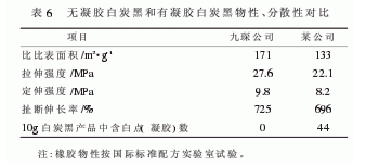 據(jù)報(bào)道,上海九琛精細(xì)化工有限公司研制成功了無(wú)凝膠高分散性白炭黑產(chǎn)品,其特征是不含200目水洗篩余物,填充這種產(chǎn)品的硫化膠中不出現(xiàn)白點(diǎn)。該公司用其產(chǎn)品和國(guó)內(nèi)某家大公司的產(chǎn)品進(jìn)行了對(duì)比,無(wú)凝膠白炭黑和有凝膠白炭黑物性、分散性對(duì)比見表6。