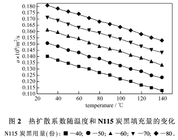 圖2列出的是在實驗溫度下,N115炭黑用量及溫度與熱擴散系數(shù)隨溫度變化的相互關系。從圖中可以看出,每種膠料的熱擴散系數(shù)隨溫度的升高,均呈現(xiàn)逐步減小的趨勢。同一溫度下,隨著炭黑用量的增加,膠料的熱擴散系數(shù)呈現(xiàn)增大的趨勢。