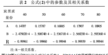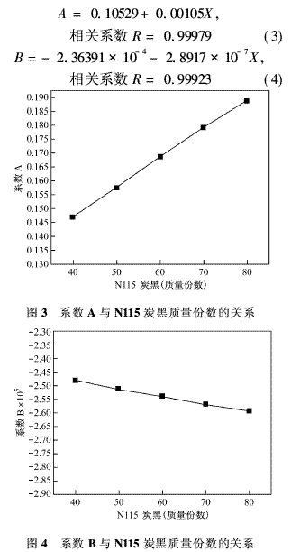 圖3和圖4分別列出了公式(2)中系數(shù)A、B與N115炭黑質(zhì)量份數(shù)的關系。從圖3和圖4可以看出,隨著質(zhì)量份數(shù)的增加,系數(shù)A逐漸增大,而系數(shù)B的絕對值也逐漸增大,這說明,隨N115炭黑質(zhì)量份數(shù)的逐漸增加,公式(2)所對應的直線的截距逐漸增加,斜率也逐漸增大。我們分別對圖3和圖4中的數(shù)據(jù)進行了回歸分析,得出如下兩方程式: