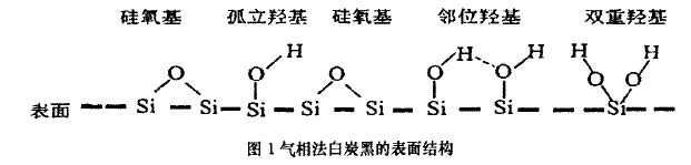 氣相法白炭黑是硅橡膠中常見補強填料的一種,是鹵硅烷在氫氧焰中高溫水解得到的無定形二氧化硅產(chǎn)品,粒子尺寸小,比表面積大。由于氣相法白炭黑是鹵硅烷水解生成的,所以有許多硅羥基(si-OH)殘留在二氧化硅表面或者聚集體內(nèi)部。殘留在聚集體內(nèi)部的硅經(jīng)基需在較高溫度(850℃以上)下才能去除,也難以檢測,但他們對產(chǎn)品的性能影響不大;殘留在表面的硅獨基活性比較高,對產(chǎn)品性能的影響很大。硅握基一般以孤立、相鄰和雙重等幾種形式存在于氣相法白炭黑表面(見圖1)。表面硅獨基的存在使氣相白炭黑極易吸附水分子,影響其使用效果;同時,表面過多的輕基的存在,也使其與有機化合物的相容性下降。而且還容易與硅橡膠中的氧形成氫鍵,導(dǎo)致膠料結(jié)構(gòu)化。