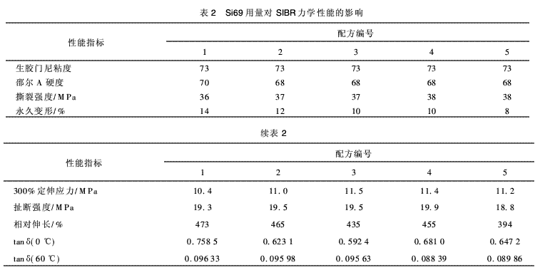 表2中所有配方的橡膠的tanδ(0℃)值都較高,說明SIBR具有良好的抗?jié)窕?Si69用量對橡膠的抗?jié)窕阅軟]有影響;而tanδ(60℃)值隨著Si69用量的增加而逐漸減小,說明Si69能夠明顯改善白炭黑在橡膠SIBR中的分布,并且Si69用量達到白炭黑用量的10%時,tanδ(60℃)值達到最低,即滾動阻力最小。