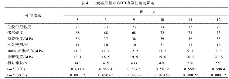 (2)白炭黑/炭黑補強的SIBR的膠料體系中,隨著白炭黑用量的增加,硫化時間延長,膠料彈性變大,滾動阻力明顯降低,橡膠的綜合性能得到提高,白炭黑用量在20份左右,橡膠的綜合性能達到最佳。