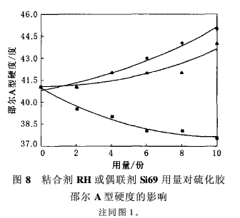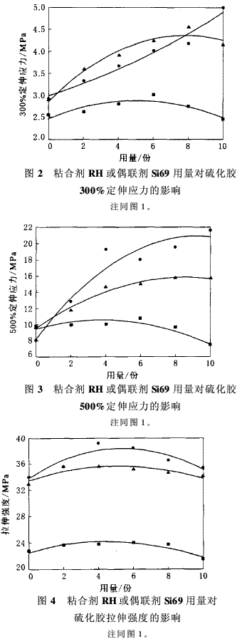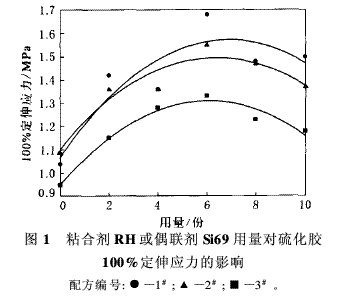 氣相法白炭黑是重要的白色補(bǔ)強(qiáng)填料,為了減小輪胎的滾動(dòng)阻力、降低車(chē)輛的燃油消耗和減輕尾氣污染[1],白炭黑在輪胎中的應(yīng)用勢(shì)在必行;在非輪胎橡膠制品中,氣相法白炭黑可以明顯提高橡膠制品的撕裂強(qiáng)度和耐老化性能。因此,白炭黑的應(yīng)用已經(jīng)引起人們的廣泛關(guān)注[2~5]。本工作在改性氣相法白炭黑填充N(xiāo)R膠料中加入粘合劑RH,制備N(xiāo)R/改性氣相法白炭黑復(fù)合材料,研究粘合劑RH用量對(duì)復(fù)合材料性能的影響,并與偶聯(lián)劑Si69/氣相法白炭黑膠料進(jìn)行對(duì)比。