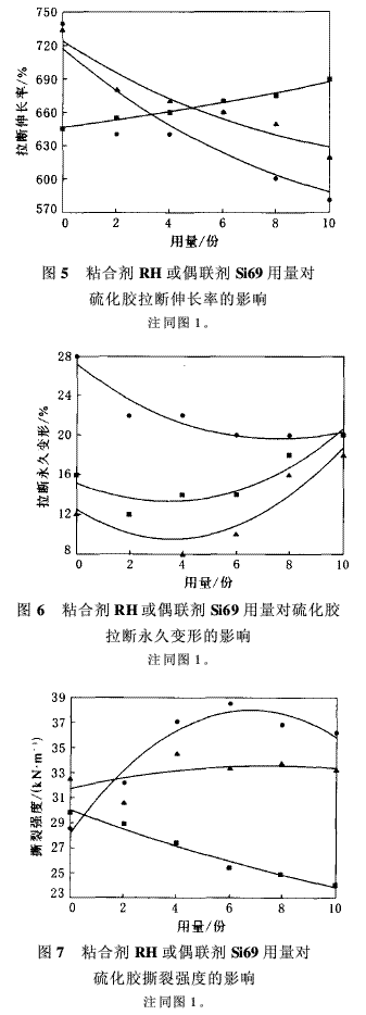反應(yīng)性物質(zhì)品種及用量對(duì)硫化膠物理性能的影響如圖1~8所示。由圖1~8可以看出,粘合劑RH或偶聯(lián)劑Si69用量對(duì)硫化膠各項(xiàng)性能均有一定影響。其中,粘合劑RH的作用更加明顯,當(dāng)粘合劑RH用量為4份時(shí),1#和2#配方硫化膠的綜合物理性能最佳,1#配方硫化膠在保持了拉斷伸長(zhǎng)率為640%的同時(shí),拉伸強(qiáng)度達(dá)到了39.18 MPa,比未加粘合劑RH的提高了14.7%。2#配方硫化膠在保持了較高的強(qiáng)度和模量的同時(shí),拉斷永久變形維持在低值,這是因?yàn)镸2改性氣相法白炭黑表面帶有反應(yīng)性的基團(tuán),能與粘合劑RH共硫化,形成一個(gè)以改性氣相法白炭黑為交聯(lián)點(diǎn)的交聯(lián)網(wǎng)絡(luò),該網(wǎng)絡(luò)能與NR的硫化網(wǎng)絡(luò)產(chǎn)生部分纏結(jié),并有部分接枝,兩者形成互穿網(wǎng)絡(luò),從而提高了體系的物理性能。而3#配方硫化膠雖然物理性能在偶聯(lián)劑Si69用量為4份時(shí)有所提高,但幅度不大。