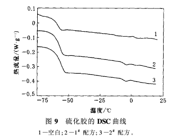 XK-160型開(kāi)煉機(jī)和25 t電熱式平板硫化機(jī),上海橡膠機(jī)械一廠產(chǎn)品;DXLL-2500型電子拉力機(jī)和XY-1型橡膠硬度計(jì),上海化工機(jī)械四廠產(chǎn)品;2910型差示掃描量熱儀,美國(guó)TA公司產(chǎn)品。