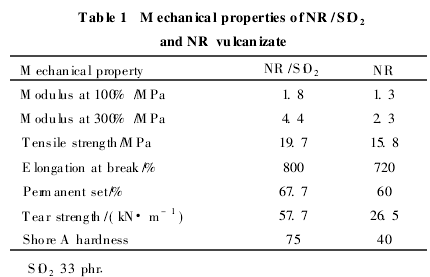 表1是NR/SiO2硫化膠及純NR硫化膠的力學(xué)性能。由表1可見,與純NR硫化膠相比,NR/SiO2硫化膠的力學(xué)性能有明顯的提高,其中300%定伸應(yīng)力較純NR硫化膠約提高了92%,拉伸強(qiáng)度提高了25%,撕裂強(qiáng)度的提高最明顯,約為118%。復(fù)合材料硫化膠的邵爾A硬度明顯增大,扯斷伸長率和永久變形有所提高。