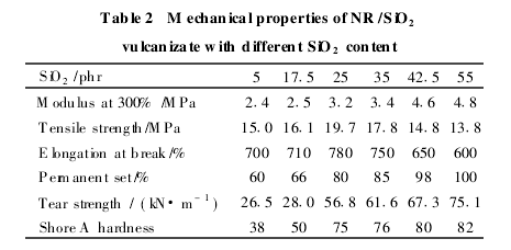 a)用就地反應(yīng)法制備的NR/SiO2硫化膠的拉伸強(qiáng)度和扯斷伸長率隨著SiO2用量的增加而出現(xiàn)峰值,在用量為25份時達(dá)到最高水平。300%定伸應(yīng)力、撕裂強(qiáng)度、永久變形和邵爾A硬度隨SiO2用量的增加而提高。