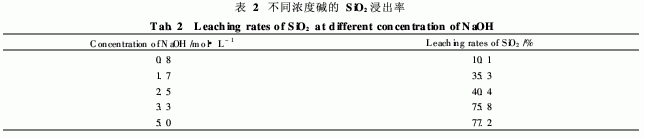 表2是采用不同濃度的NaOH溶液,反應溫度為100℃、反應時間為4. 0h的實驗條件下得出的SiO2浸出率結果。
