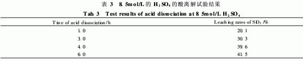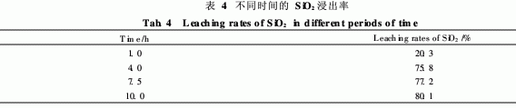 表3是采用8. 5 mol/L的H2SO4,反應溫度為90℃,分別為不同時間下進行酸離解所得的實驗結果,由表3可知,酸離解時間越長, SiO2的浸出率越高,從成本方面考慮,本文的酸離解時間采用4. 0h。