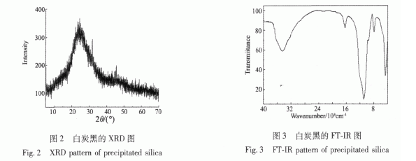 (4)堿離解法制備的白炭黑產品中, SiO2的純度為91. 8%,比表面積(BET法)為114m2/g,并經XRD、FT-IR、TEM確定其為完全無定型狀態(tài)的水合二氧化硅,所得產品符合HG/T 3061-1999的要求。
