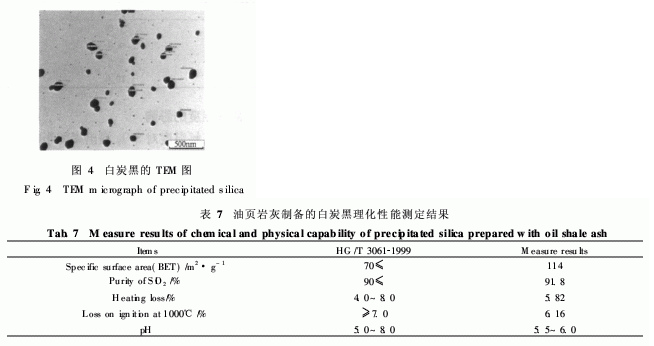 白炭黑的其他指標為白度為98. 4,Al2O3含量為2. 67%,Fe3+含量為0. 66%。如表7所示,采用堿離解法從油頁巖灰制備白炭黑,所得產品符合行業(yè)標準HG/T 3061-1999的要求。