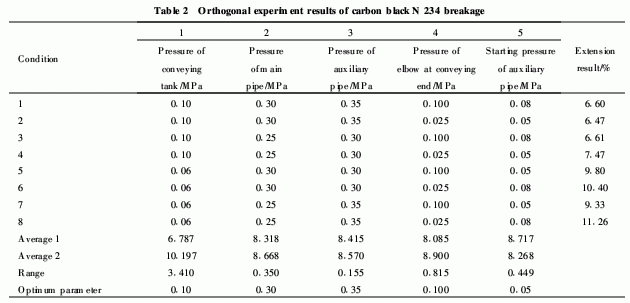 從表2可以看出,影響輸送的主要因素依次為壓送罐壓力、輸送末端的彎管壓力、輔管開啟壓力、主管壓力和輔管壓力。由于賽輪公司須根據(jù)生產(chǎn)的需要來決定每天炭黑的輸送量,因此本試驗至2006年4月底只對炭黑N 234做完了一輪正交試驗,而對其他炭黑還沒有完成正交試驗表所列出的8次試驗,因此對于本試驗的結(jié)果還有待后續(xù)試驗來補(bǔ)充完善,并通過大量的統(tǒng)計分析做出結(jié)論。從經(jīng)驗的角度推斷,壓送罐的壓力越大,出料蝶閥開啟后輸送管道中的料氣混合比越大,阻力越大,所以在輸送的前半程物料的運(yùn)動速度較低,粒子破碎率也低;至輸送后半程時,由于輸送管道中部分物料進(jìn)入日罐,管道中物料減少,阻力降低,進(jìn)氣量特別是輔管進(jìn)氣量增大,導(dǎo)致管道中的氣速增大,粒子破碎率增加。此時如果給定較高的彎頭結(jié)束輸送壓力和輔管開啟壓力,則可以有效地降低炭黑粒子的破碎率。