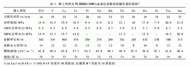 采用Y(釔)、La(鑭)、Ce(鈰)、Pr(鐠)、Nd(釹)、Rb(銣)、Tb(鋱)、Dy(鏑)、Ho(鈥)、Er(鉺)、Tm(銩)及Sm(釤)等12種稀土分別摻雜炭黑,得到HAF-Ln,制備得到了12種P(CR232/HAF-Ln),其硫化膠的物理機械性能如表1所示