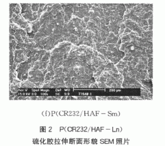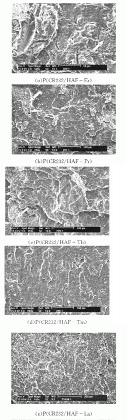 圖2是不同稀土摻雜的P(CR232/HAF-Ln)的拉伸斷面SEM形態(tài)。其中,稀土的用量均為m(Ln)/m(HAF)=1/100。