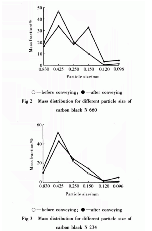 另外,由于炭黑具有吸濕性,若其在大氣環(huán)境中存放時(shí)間過長(zhǎng),容易結(jié)塊,不但會(huì)影響正常輸送和輸送效率,還會(huì)增加輸送后管道內(nèi)的殘余量。因此,為了實(shí)現(xiàn)正常輸送,必須提高輸送壓力和輸送速度,必然引起炭黑的破碎率增大;同時(shí),為了去除輸送管道內(nèi)的殘余炭黑,必須加大清掃力度,也增大了炭黑的破碎率。