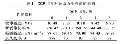 (1)在動態(tài)硫化過程中,MFR隨交聯(lián)劑DCP用量的增加單調(diào)上升,DCP的加入使體系中PP降解。隨DCP用量的增加,體系的斷裂伸長率、永久變形和拉伸強度呈下降趨勢。